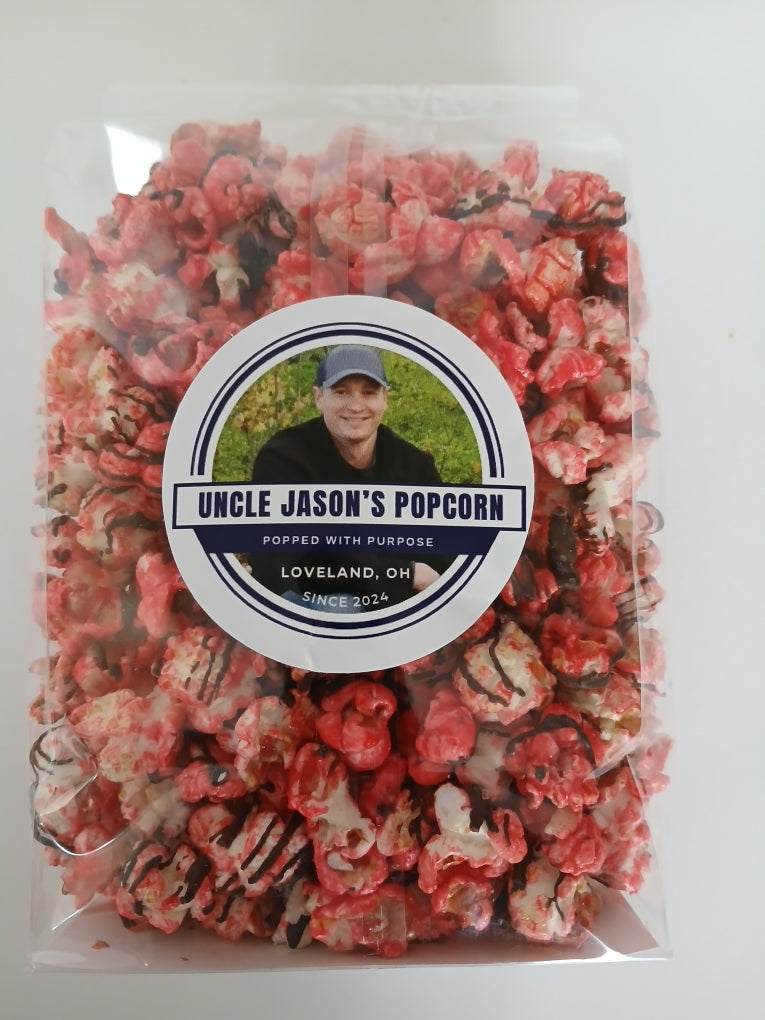 Uncle Jason's Candy Cane Chocolate Drizzle Popcorn.